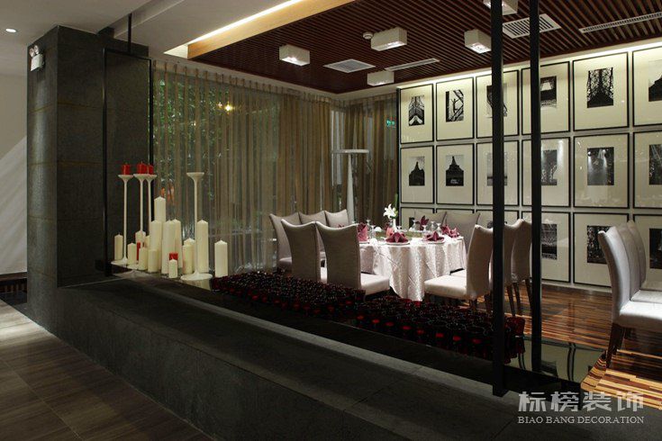 本案是中餐和西餐结合起来,两种不同的方式却能够巧妙的结合在一起。功能区域上91视频APP官网下载还是按照中餐的方式来进行划分但是在餐桌椅的选择上91视频APP官网下载则考虑西餐的部分,大厅区域顶面采用木质顶面暗槽留灯,右侧的红酒展示和陈设的展示为大厅带不少装饰色彩。功能上有散座、卡座、包间,整体顶面采用石膏板造型吊顶卡座区的墙面壁纸铺贴镜面作为装饰造型,包间有半开放和开放两种设置圆桌可容納多人就餐顶面处理也有所不同有木质顶面和石膏板顶面之分与整体的色彩相结合。